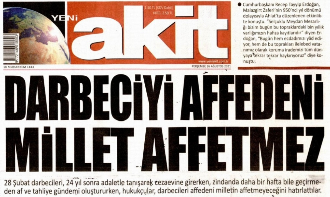 Akit, “Darbeciyi affedeni millet affetmez” başlıklı haberinde, “28 Şubat darbecileri, 24 yıl sonra adaletle tanışarak cezaevine girerken, zindanda daha bir hafta bile geçirmeden af ve tahliye gündemi oluştururken, hukukçular, darbecileri affedeni milletin affetmeyeceğini hatırlattılar” ifadelerine yer verdi.
