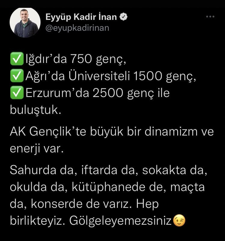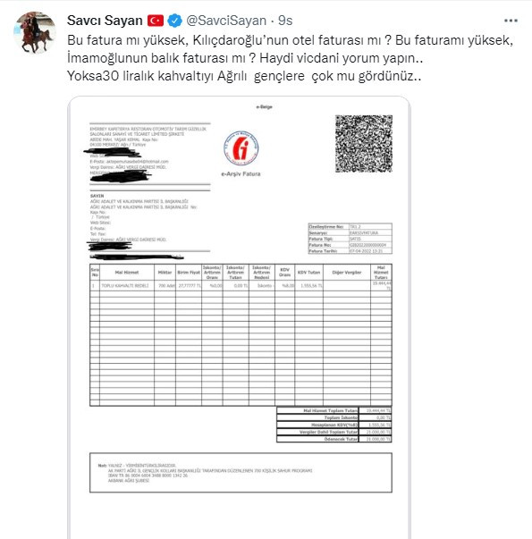 Sayan, 700 kişilik sahur etkinliği için bin 555 lira 54 kuruş KDV ve hizmet bedeli olarak 19 bin 444 lira 44 kuruş ödendiğini söyleyerek, sahurun faturasını gösterdi. Ancak AKP Gençlik Kolları Başkanı Eyyüp Kadir İnan, çeşitli şehirlerden paylaştığı sahur fotoğraflarında Ağrı’daki etkinliğin 1500 öğrenciyle gerçekleştirildiğini yazmıştı.