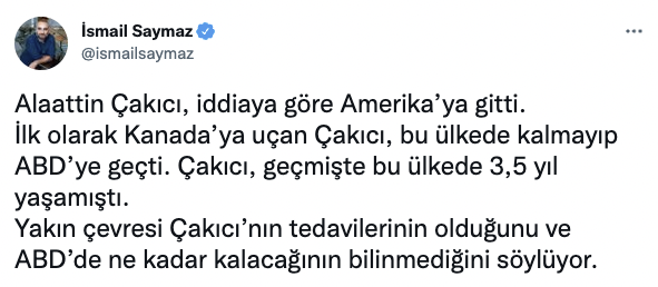 Birçok sağlık sorunu bulunan Alaattin Çakıcı’nın, Amerika’ya gitme nedeninin tedavi amaçlı olduğu öğrenildi. Yakın çevreden alınan bilgiye göre, Alaattin Çakıcı’nın Amerika’da ne kadar kalacağı bilinmiyor. Gazeteci İsmail Saymazi iddiları şu şekilde paylaştı: