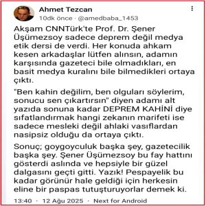 “Akşam CNN Türk’te Prof. Dr. Şener Üşümezsoy sadece deprem değil, medya etik dersi de verdi. Adam ‘Ben kahin değilim, olguları söylerim’ diyor, siz ekrana ‘Deprem Kahini’ yazıyorsunuz. Bu hem mesleki hem ahlaki hatadır. Goygoyculuk başka şey, gazetecilik başka şey.”