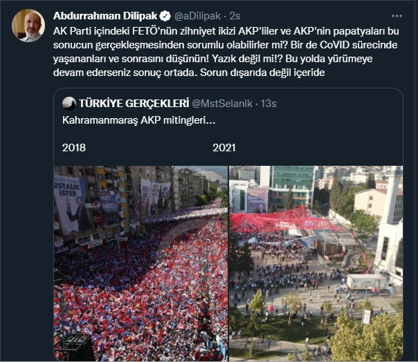 AKP’nin mitinginde meydanın boş kalması dikkatlerden kaçmayarak bir çok muhalif haber kuruluşunda haber olmuştu. Dilipak bu görüntüye Twitter’daki paylaşımında dikkat çekerek “Bu yolda yürümeye devam ederseniz sonuç ortada.” Diye yazdı.