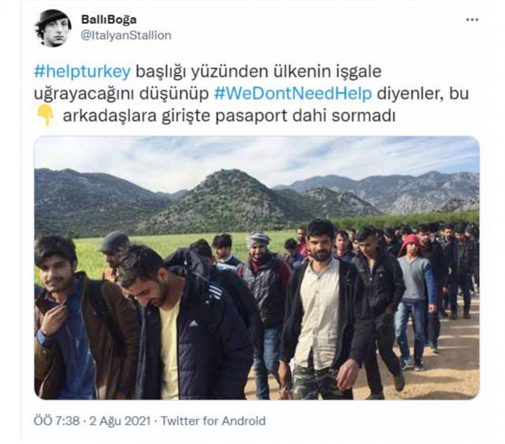 Bir sosyal medya kullanıcısı yaptığı paylaşımda, “#helpturkey başlığı yüzünden ülkenin işgale uğrayacağını düşünüp #WeDontNeedHelp diyenler, bu arkadaşlara girişte pasaport dahi sormadı” ifadelerine yer verdi.